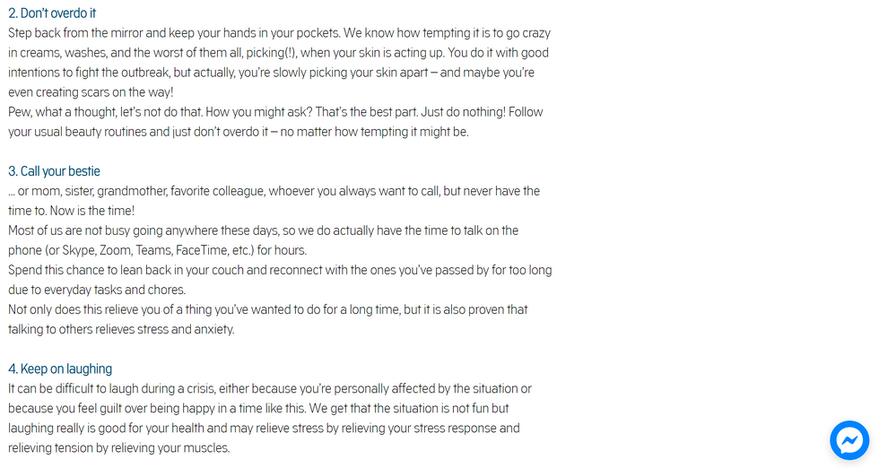 This blog post was written during Covid-19 for the brand Kleresca by Klox Technologies. The aim was to show empathy for the consumers' situation and maintain a relationship though the crisis had stopped the possibility for clinics to perform treatments. It was published at Kleresca.dk in May 2020 - read it here.